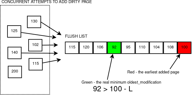 This way we have guarantee, that the maximum delay in flush lists is limited by L. That's because we disallow adding dirty page with too high lsn value until pages with smaller lsn values (smaller by more than L), have been added!