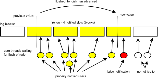 The waiting is solved using array of events. The user thread waiting for a given lsn, waits using the event at position: