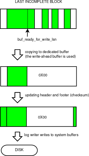 If any complete blocks were detected, they are written directly from the log buffer (after updating headers and footers). Afterwards the log writer thread retries the previous step before making next decisions. For each write consisting of one or more complete blocks, the MONITOR_LOG_FULL_BLOCK_WRITES is incremented by one.