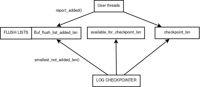Up to this lsn all dirty pages have been flushed to disk. However, this value is not guaranteed to be the maximum such value. As insertion order to flush lists is relaxed, the buf_pool_get_oldest_modification_approx() returns modification time of some page that was inserted the earliest, it doesn't have to be the oldest modification though. However, the maximum difference between the first page in flush list, and one with the oldest modification lsn is limited by the buf_flush_list_added->order_lag().